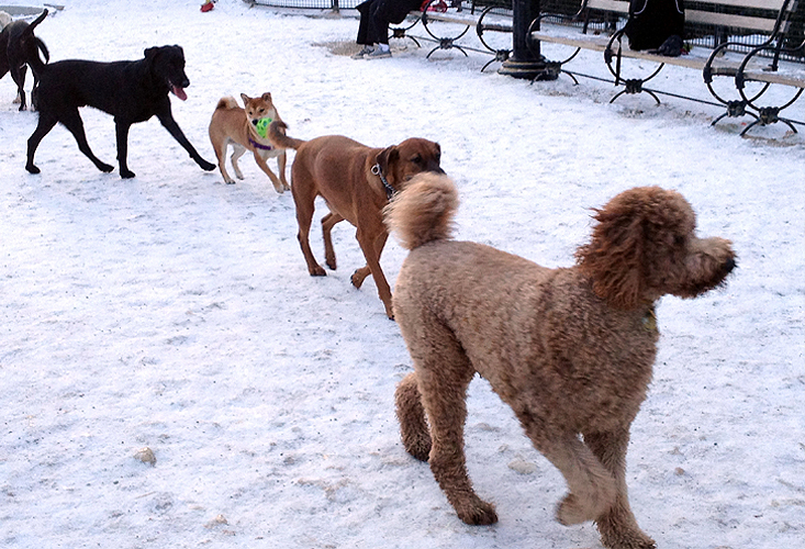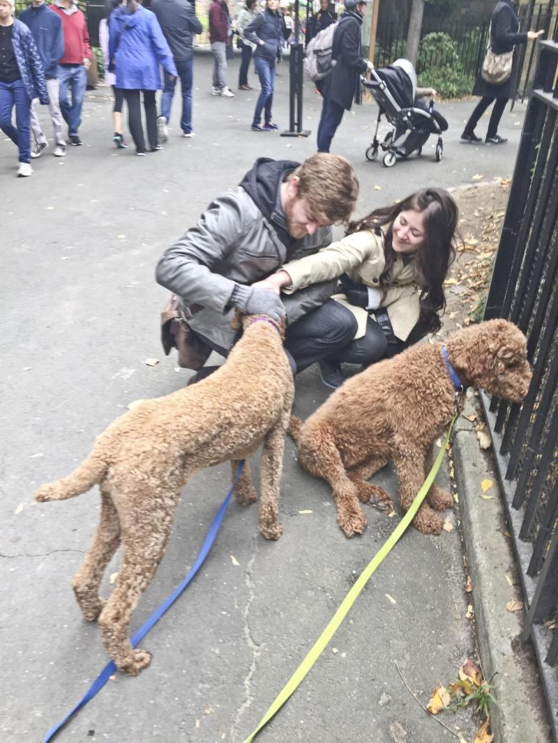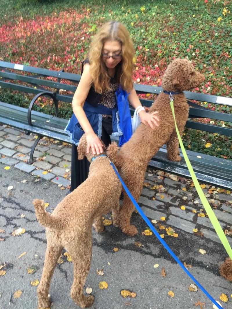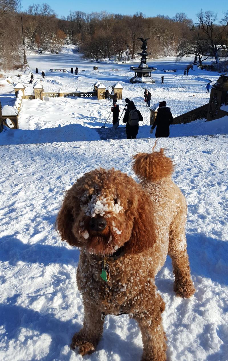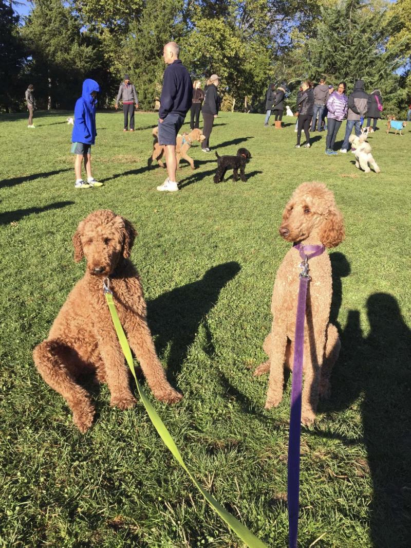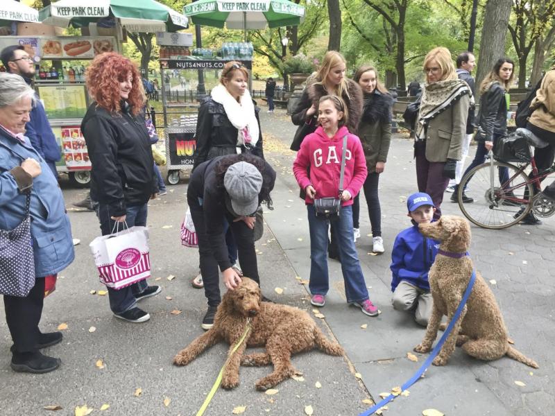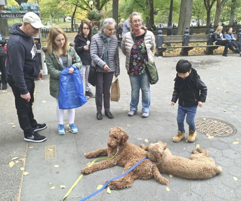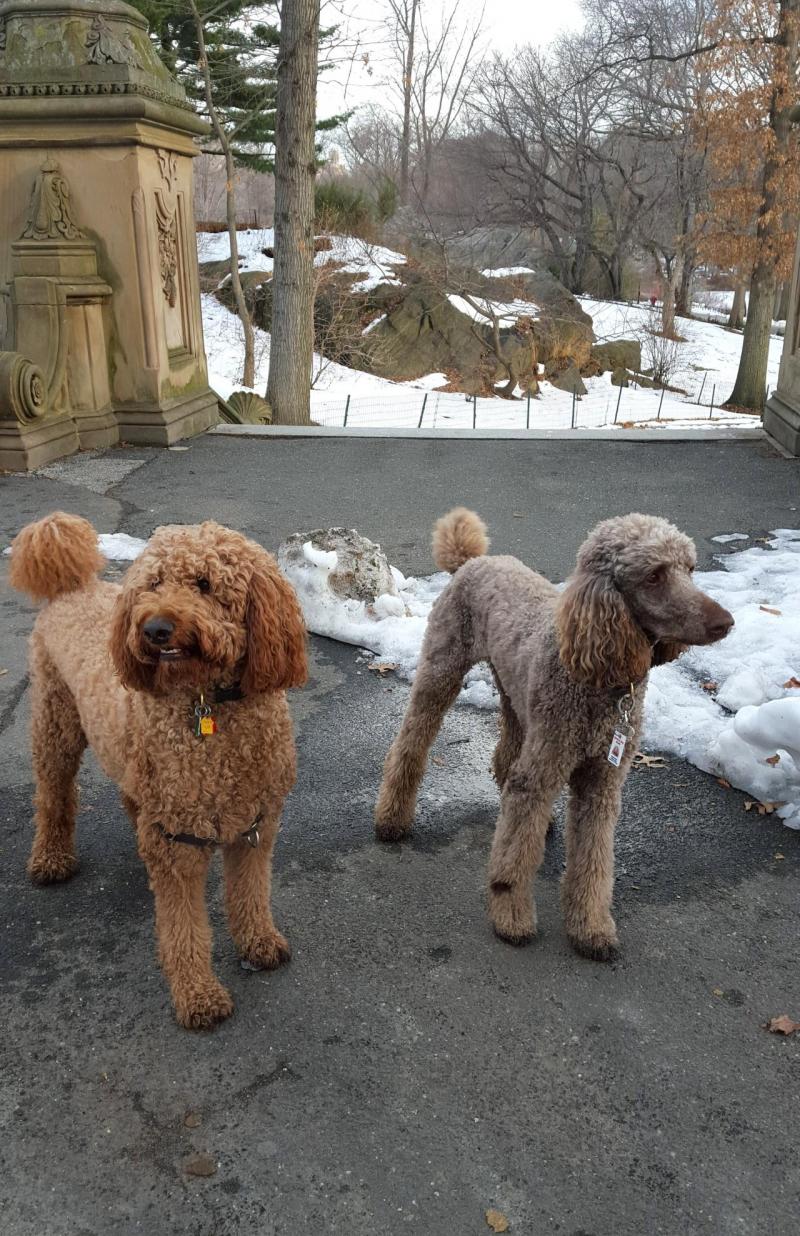 Many of our poodles live in NYC and often play in Central Park. Recently Penny & Bella met up with their half brother Dobie who also has a group of friends that love to follow and play with him. :)